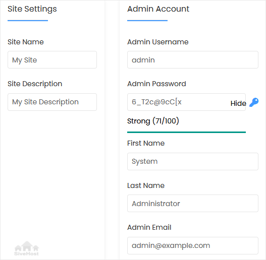 - Admin Username: Your new MovableType username (for security reasons, do not use the administrator or the admin username).